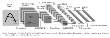 Image Input -> (Convolution) -> Feature Map -> (Pooling) -> Feature Map -> (Convolution) -> Feature Map -> (Pooling) -> Feature Map -> (Flatten) -> Feature Vector -> (FCNN) -> Feature Vector -> (FCNN) -> Feature Vector -> (Gaussian Connection) -> Output Vector